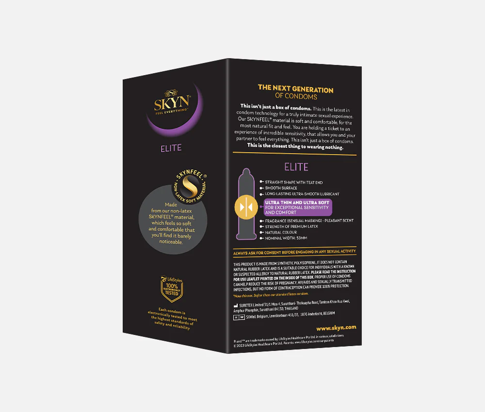 - 50 condoms supplied as 5 × SKYN® Elite 10 piece packs