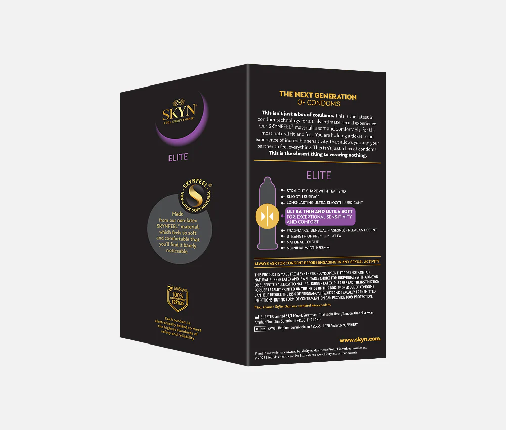 - FREE : 20 Elite condoms supplied as 2 × SKYN® Elite 10 piece packs