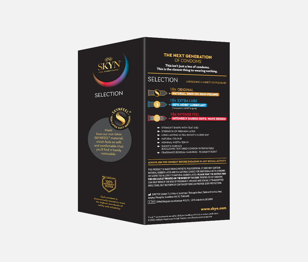 - 54 condoms supplied as 6 × SKYN® Selection 9 piece packs