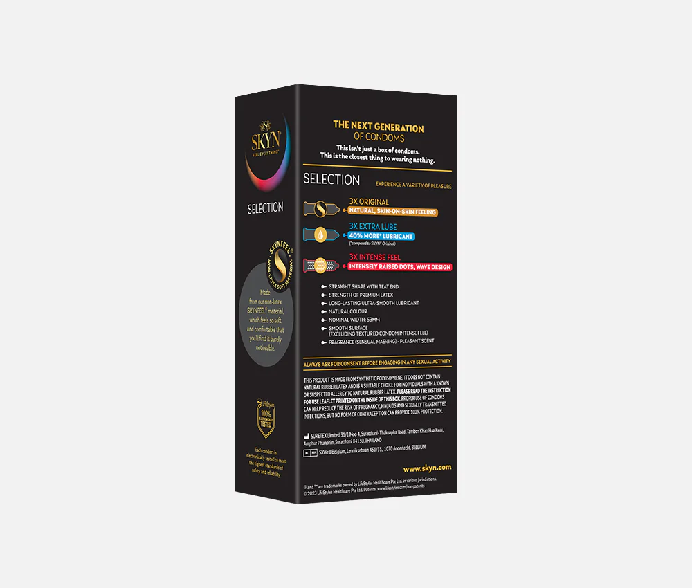 - Variety of sensations: SKYN® Selection Variety pack features 3 types of assorted lubricated non-latex condoms including 3 Original, 3 Intense Feel and 3 Extra Lube condoms.